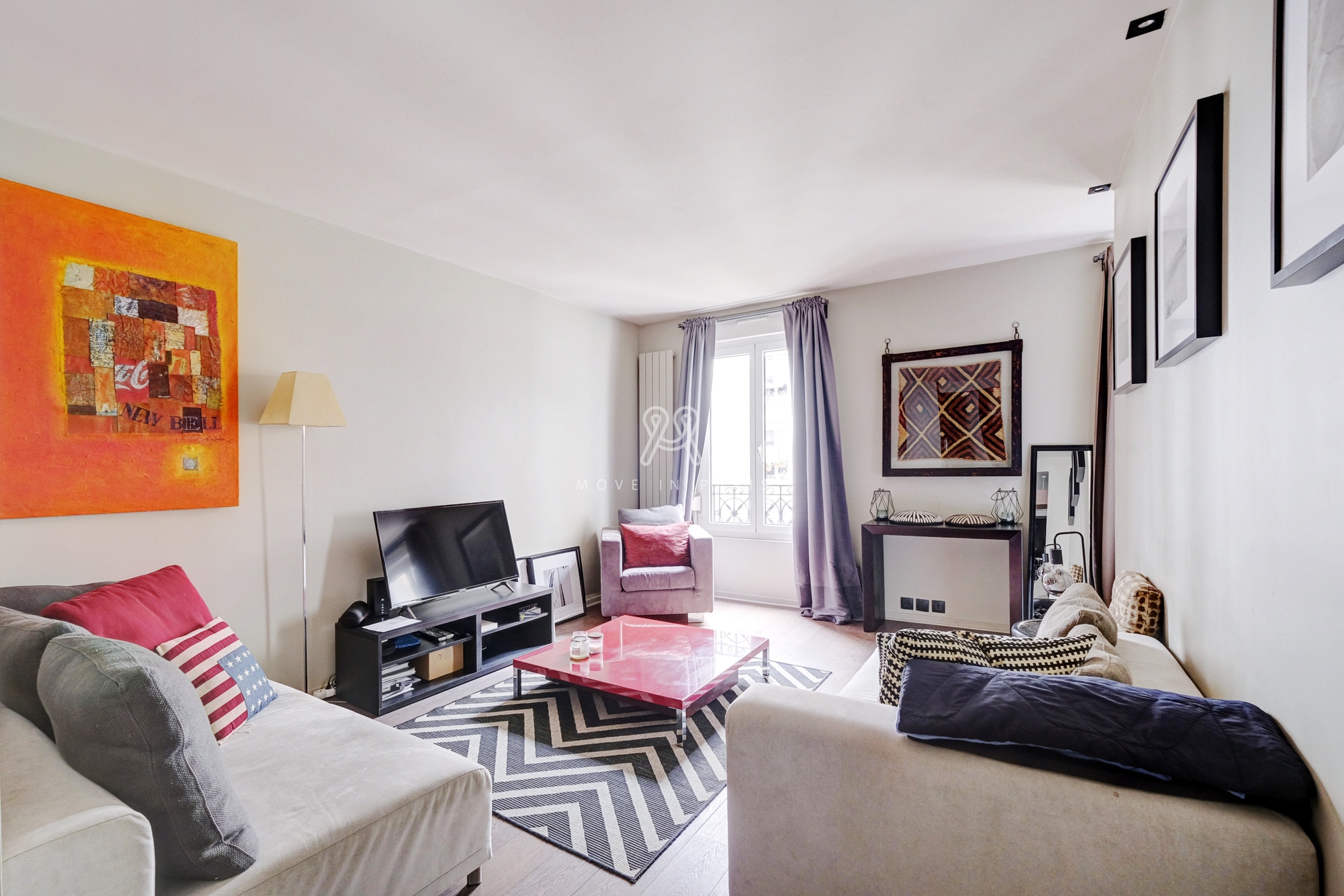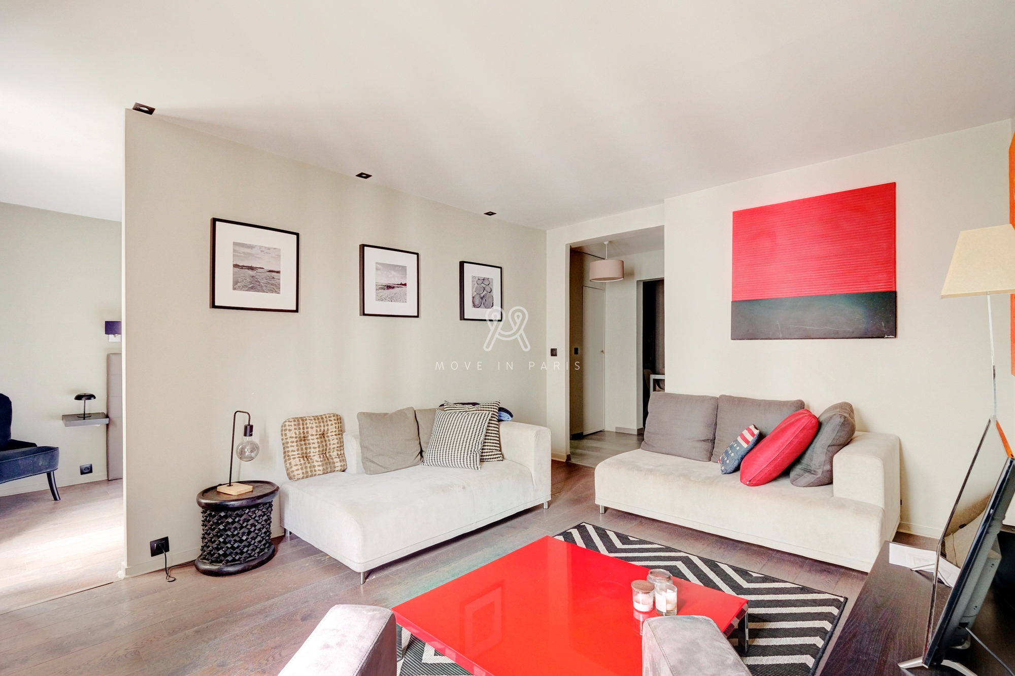 Au 3eme étage avec ascenseur sur cour d’un immeuble ancien. Un séjour avec canapé 4 places, une table basse et un Tv écran plat.