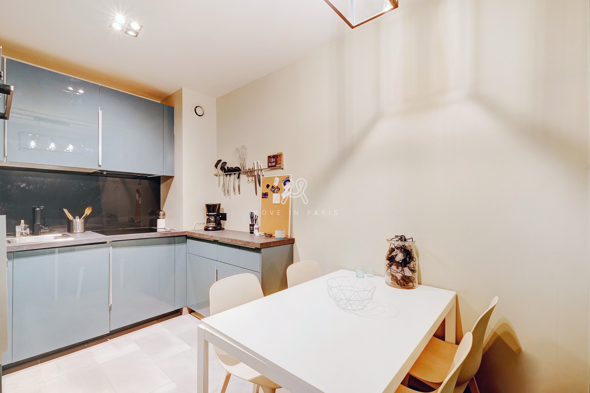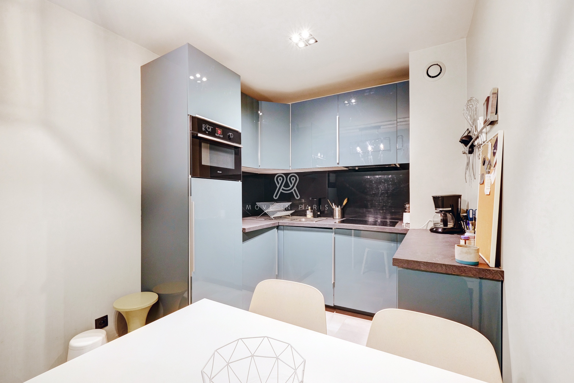 Une cuisine séparée toute équipée et aménagée avec table dinatoire. Équipement : four mixte, plaque de cuisson induction, réfrigérateur, machine à café Nespresso, Machine à laver.